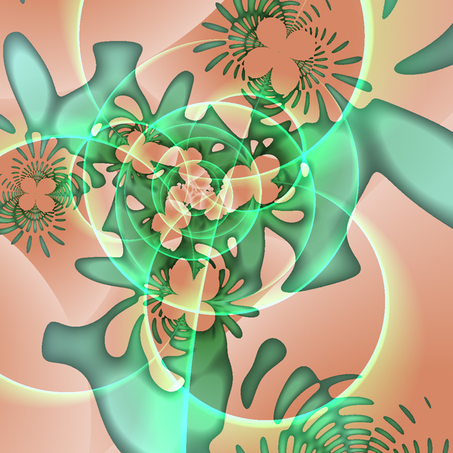 明るくカラフルな作品を狙いました。フラクタルらしくないフラクタル作品に仕上がって、なかなか満足しています。 |